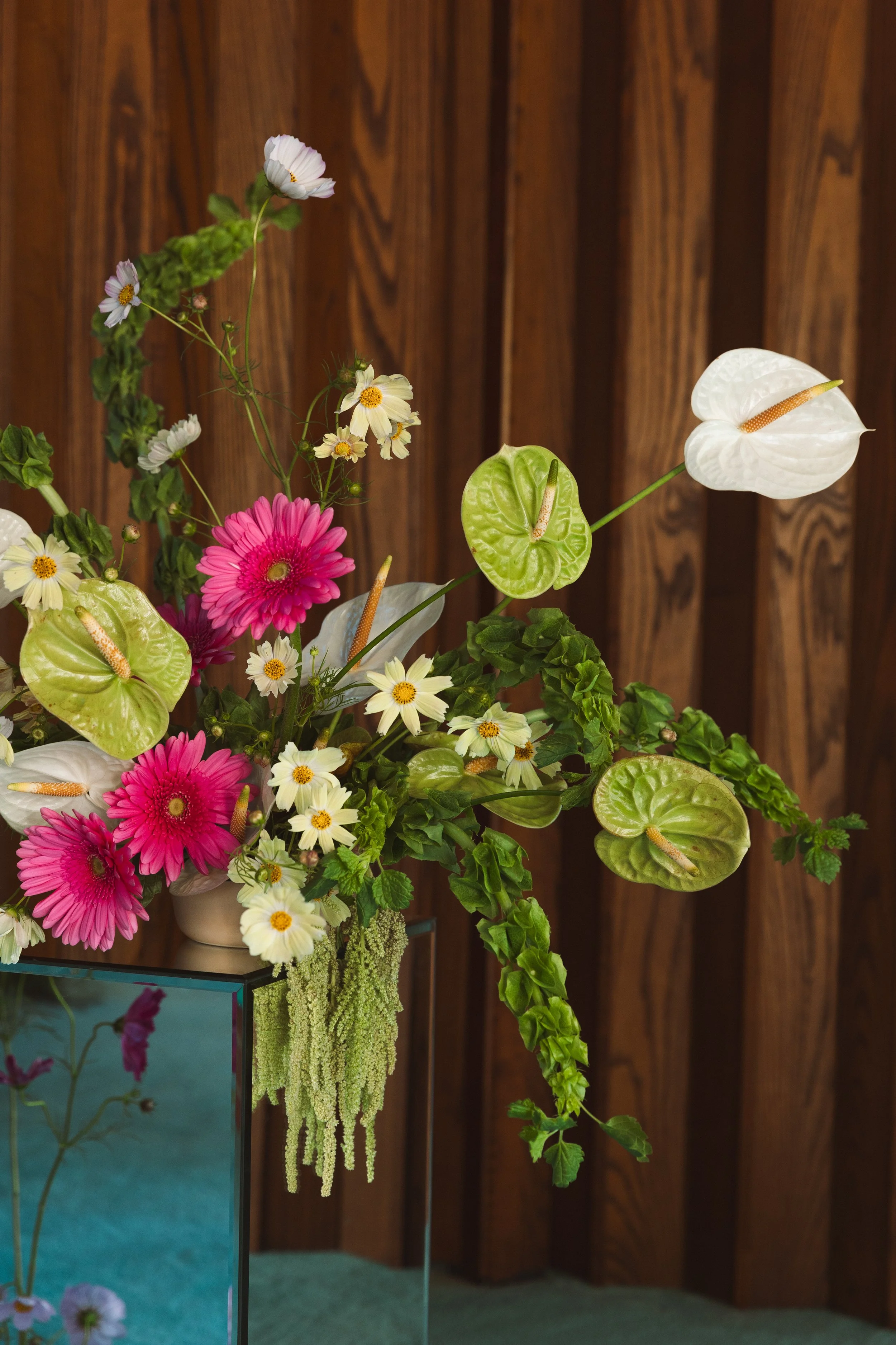 Then we moved over to the wooden walls to create a contrasting moment with the blue carpet. The florals paired with the mirrored pedestals and Chosen by Kyha lace dress added the perfect modern touch to the retro atmosphere.