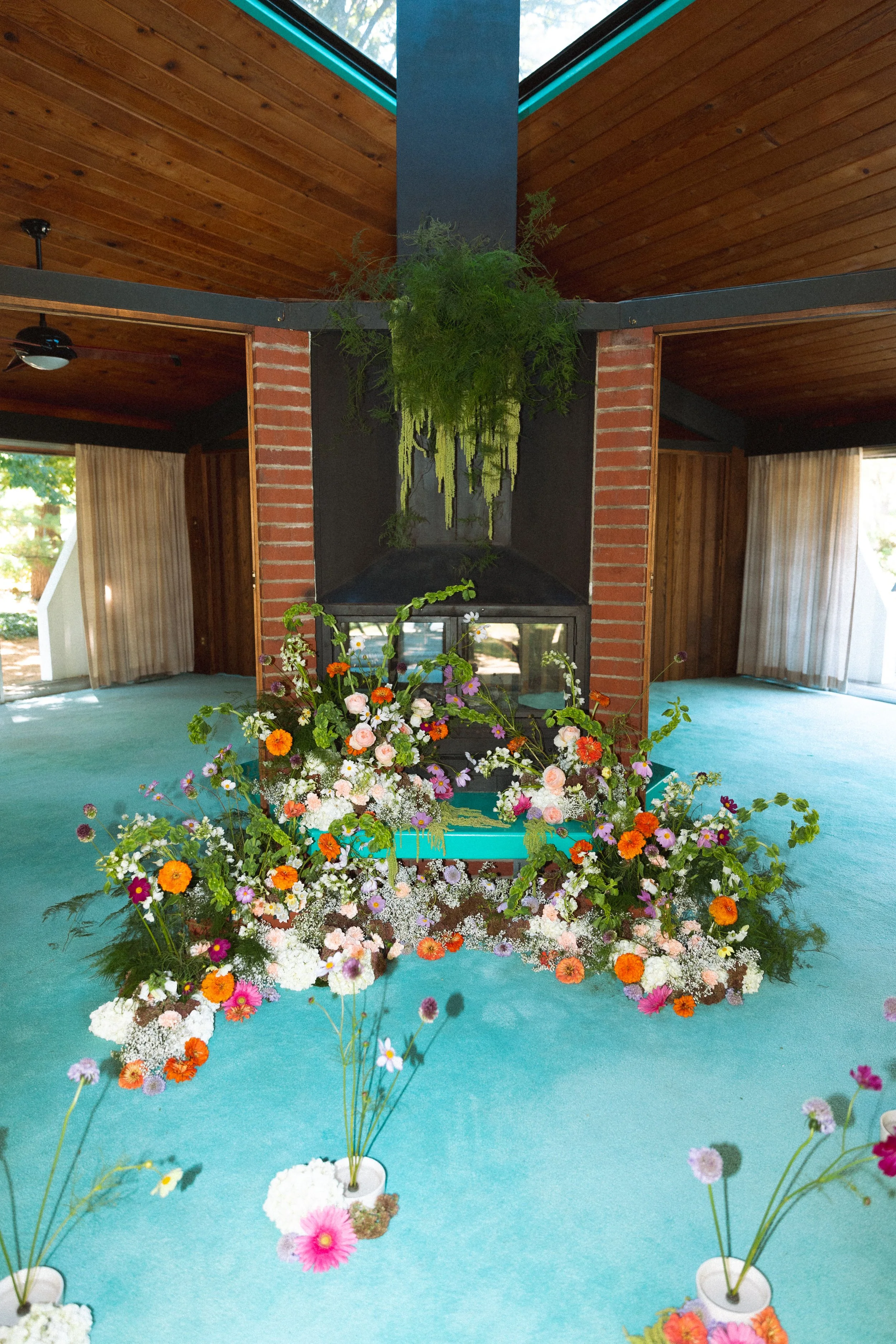 Sometimes the setting for a shoot inspires the entire look and vibe. That was certainly the case when we created the florals for this Bride KC Look book. The retro house had wooden paneled walls, bright blue carpet and yellow countertops. It was full of inspiration, whimsy and color so we made sure that the flowers matched.